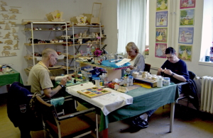 Teilnehmer beim Bemalen einzelner Spielgeräte in den Werkstätten der GAB Berlin mbH |